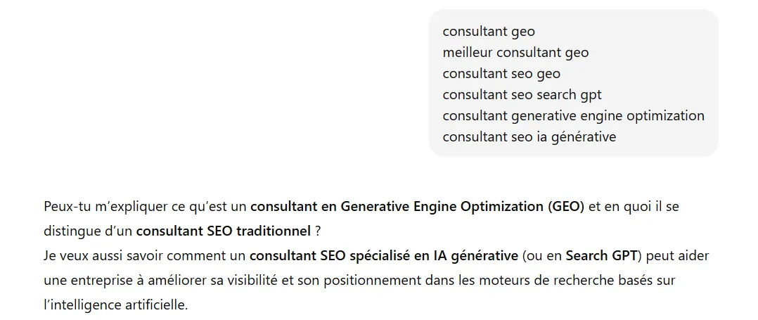 Quoi qu'il en soit, ce que je propose est de récupérer parmi ces requêtes celles qui paraissent les plus intéressantes (un nettoyage est souvent nécessaire car un contenu se positionne souvent sur des requêtes improbables) et de tenter, à partir de là, de reconstituer un ou plusieurs prompts d'origine dans ChatGPT.
