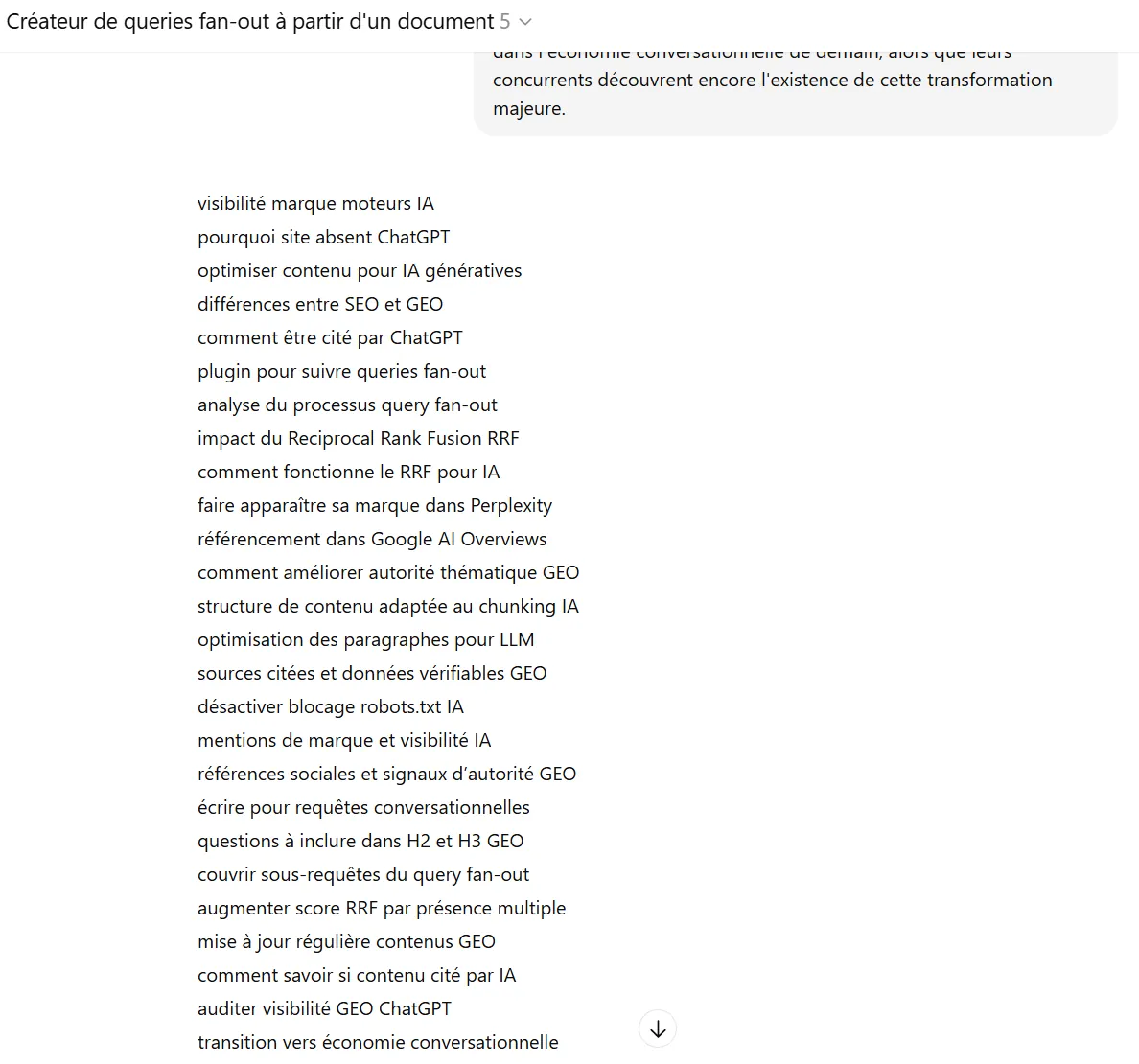 Je me suis, encore une fois, amusé à créer un GPT personnalisé pour générer un fanout de requêtes à partir d'un contenu. N'hésitez pas à tester.